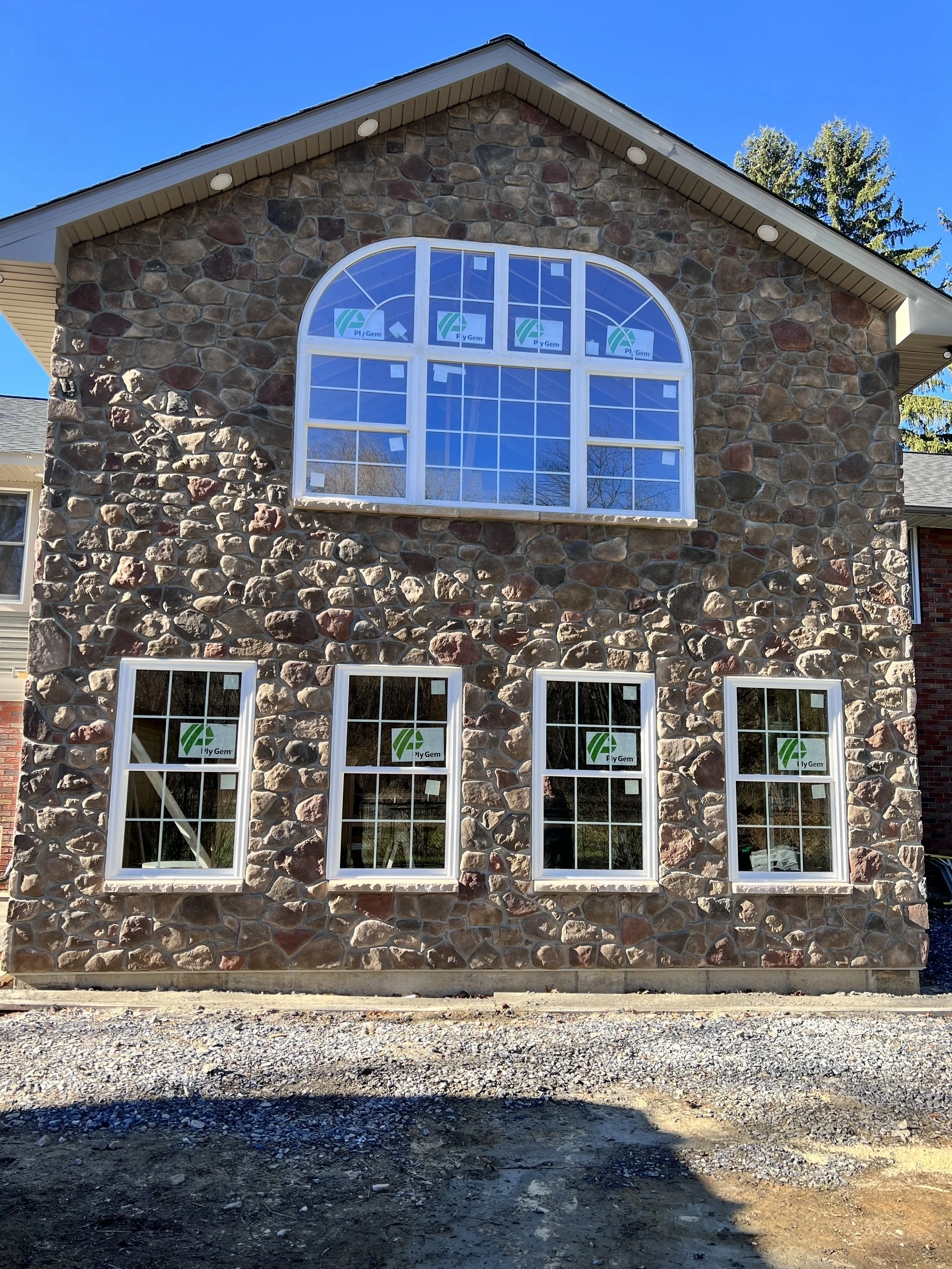 The stonework was intentionally chosen to stand out — adding richness, texture, and contrast that elevate the entire look of the property. The lower level showcases six new windows to maximize natural light, while the upper level features a dramatic arched picture window that adds elegance and visual interest.