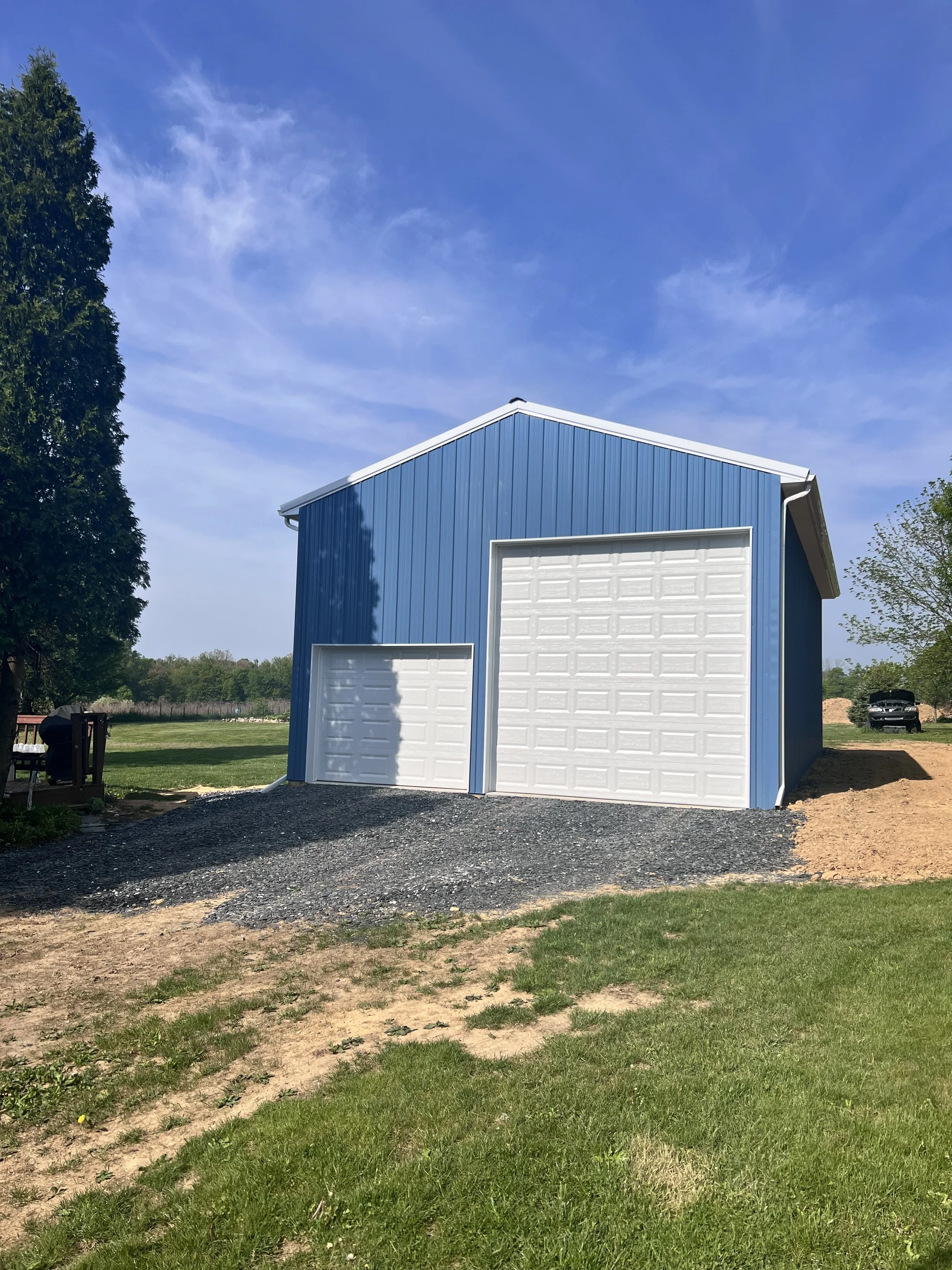 This bold and functional custom pole building was designed to meet both heavy-duty storage needs and aesthetic standards. The structure is finished with durable 28-gauge metal panels in a striking blue, paired with crisp white trim and overhead doors for a modern, professional look that stands out on any property.